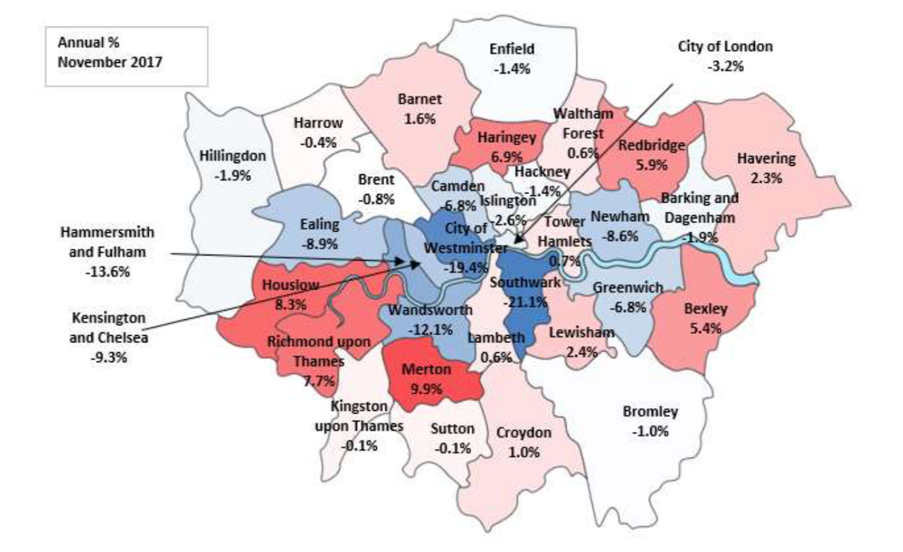 London’s property price inflation rate was below the national average throughout 2017