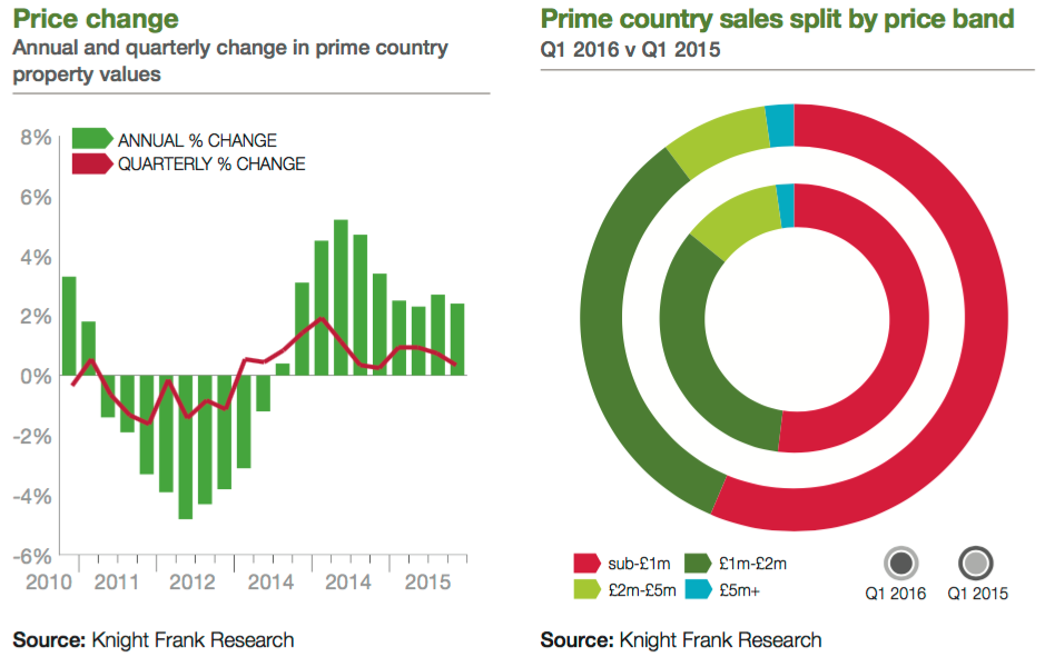 Prime country house prices are still 13.6% below their 2007 peak, says Knight Frank, after growth slowed to +2.4% in the year to March 2016 (London prices by similar metrics are 33% above 2007's level).
