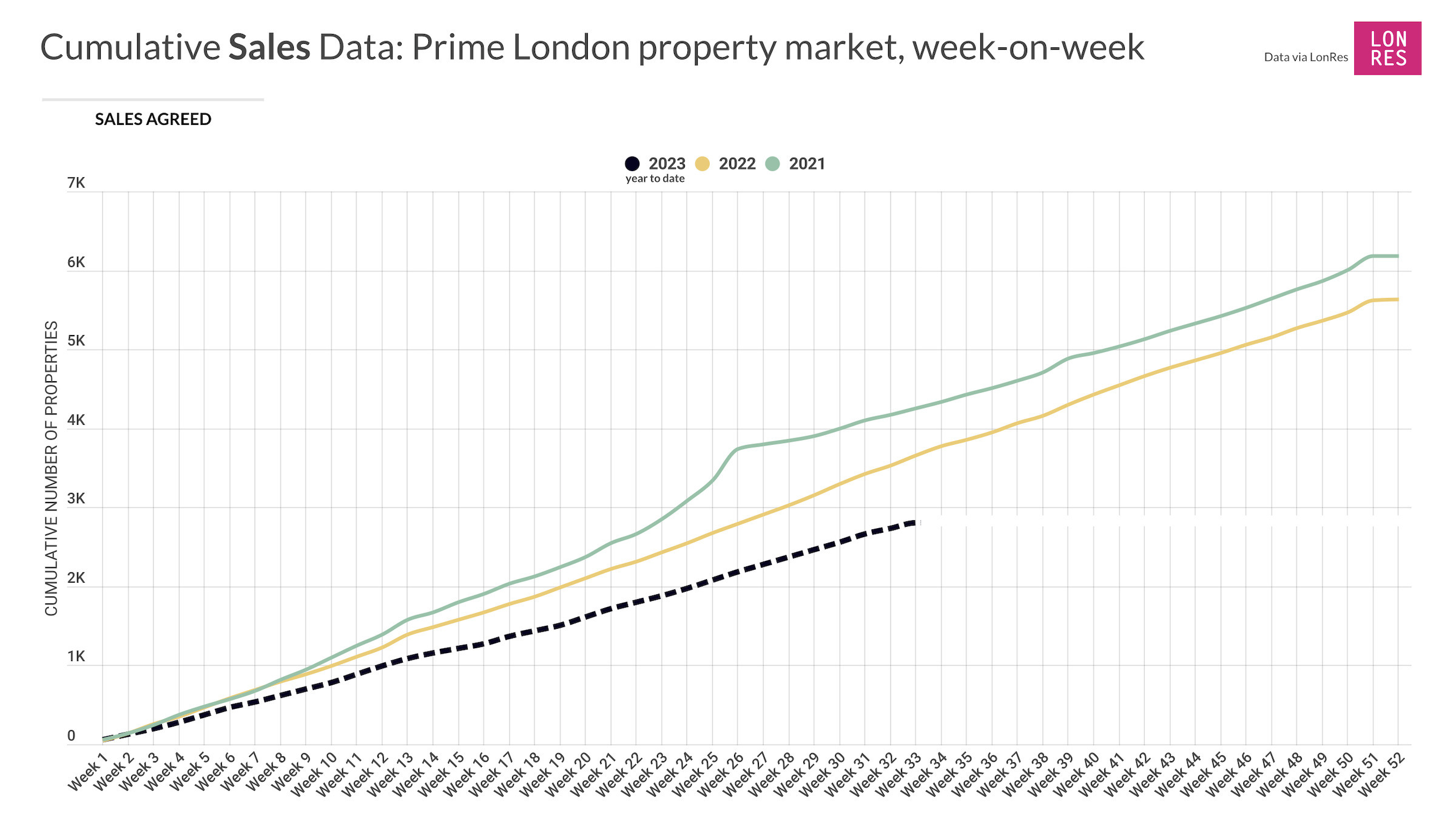41% fewer property sales were agreed in prime London last week compared to the same week in 2022, according to the latest PrimeResi Data Hub update.