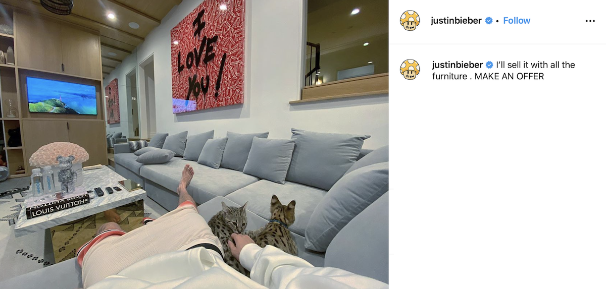 Justin Bieber has asked his 120 million Instagram acolytes if any of them want to buy his $8.5m house in Beverly Hills. "I'll sell it with all the furniture", he commented; "MAKE ME AN OFFER"